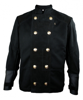 Knappområdet er laget av lær. Jakken har skinnkledning på skuldrene og mansjettene er også laget av lær.